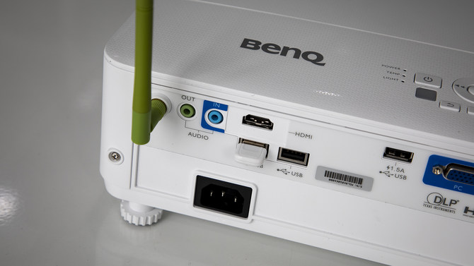 接口方面,明基E582提供了音频、视频和S端子。商务常会用到的HDMI接口,VGA输入/输出接口视频接口全都拥有,USB接口可满足不同设备、多场景的需求。此外,这款投影机还附带了一根天线,与机身相连接后,可以实现热点发射。