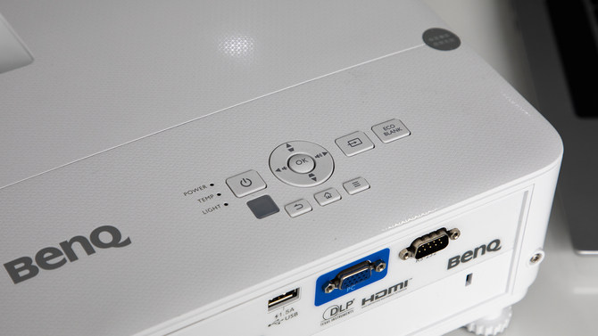 明基E582商务投影机可投画面尺寸为60”-200”,机身外观非常简洁,并且机身上设计有简单的实体按键,当我们不方便使用按键的情况下也可以使用遥控器进行操作。