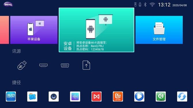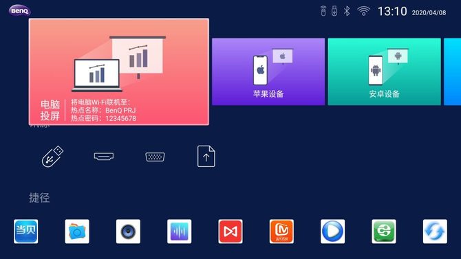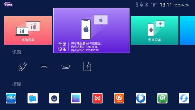 明基E582商务投影机还自带市场应用,目前资源还不是很丰富。但明基E582的智能系统支持通过U盘或者应用市场安装第三方应用软件,从而应对系统资源不足形成扩充、弥补短板。