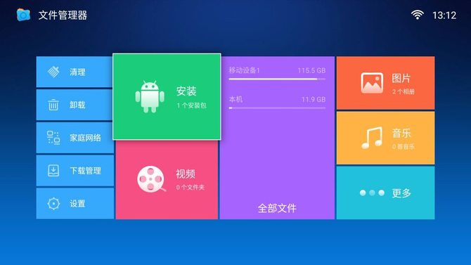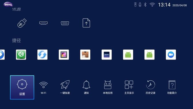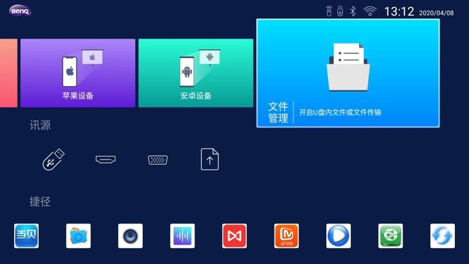 明基E582商务投影机拥有智能安卓系统,其UI系统设计非常简洁,系统主界面分为直连投屏、电脑投屏、手机投屏以及文件管理器四大板块,以及本地应用、应用市场和设置等常用功能区块。