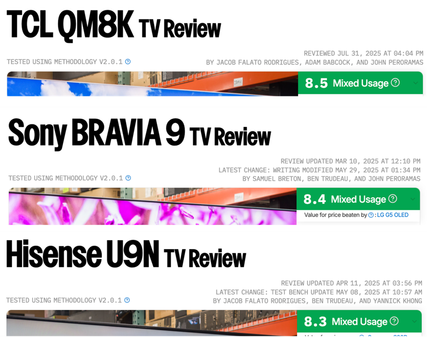 但这次,TCL在其专业领域获得了更高的认可,根据国外专业电视评测机构Rtings最新出具的评分报告显示,TCL QM8K(对应国内款Q10L系列)以8.5的综合评分超越索尼9系和海信U9N,位列今年Mini LED电视新品的第 一名。