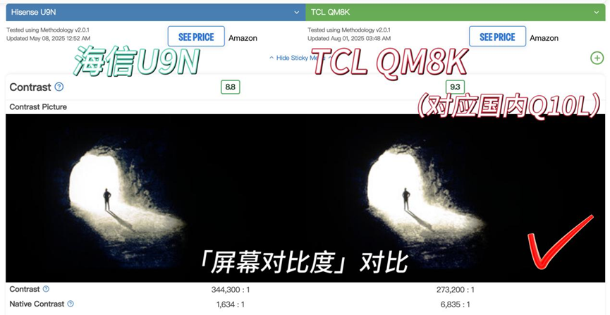 TCL QM8K(对应国内款Q10L系列)对比度评分高达9.3,优于索尼9系的8.9分和海信U9N的8.8分;TCL QM8K(对应国内款Q10L系列)评分高得益于其搭载的高对比度屏,原生对比度实测接近7000:1。