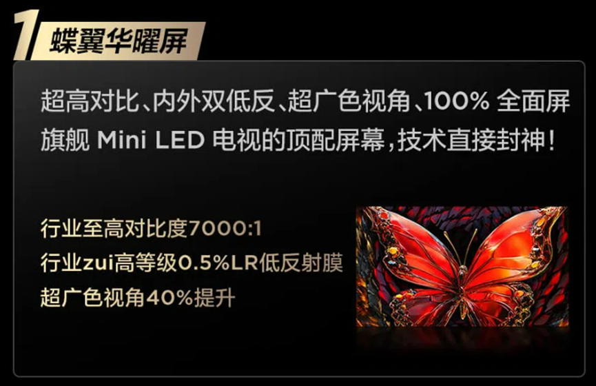 TCL将技术重心回归到画质本源,回归到屏幕本身,才有了蝶翼华曜屏的诞生。它以超高对比度、低反光等优势,拓宽了Mini LED电视的画质表现空间,拔高了整个Mini LED行业的技术标准,可以说是现在Mini LED电视里面的顶配屏幕了。