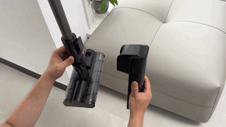 沙发同样是我们日常用到吸尘器的主战场之一,MOVA蜻蜓吸尘器采用了长扁吸二合一的替换设计,让我们随时切换两种模式,在应对表面及缝隙等不同的清洁区域的时候,能够自由切换,大大方便了我们的日常打扫,这点真心不错,同时二合一的设计,也能有效防止吸头的丢头,非常贴心。