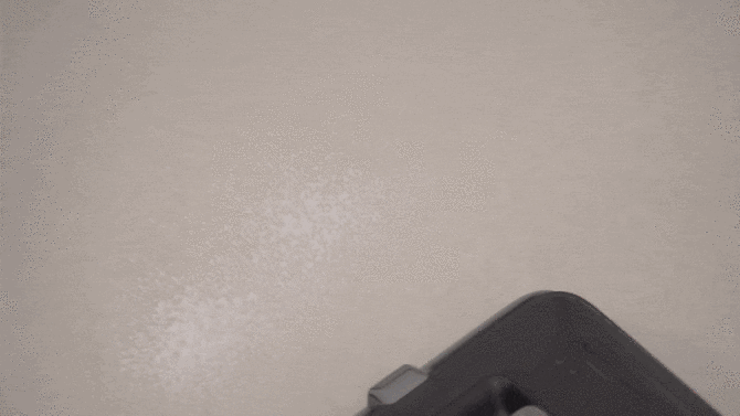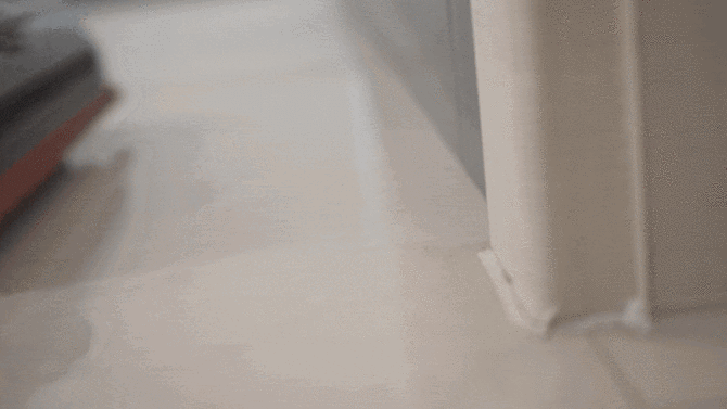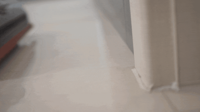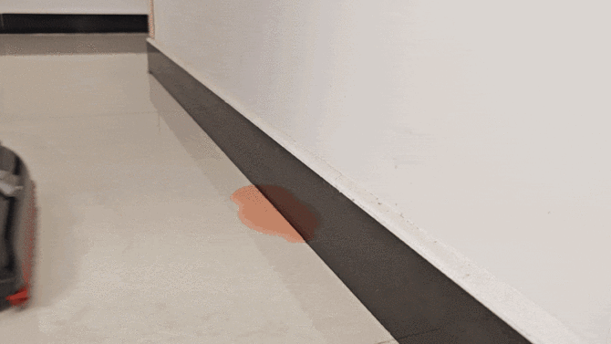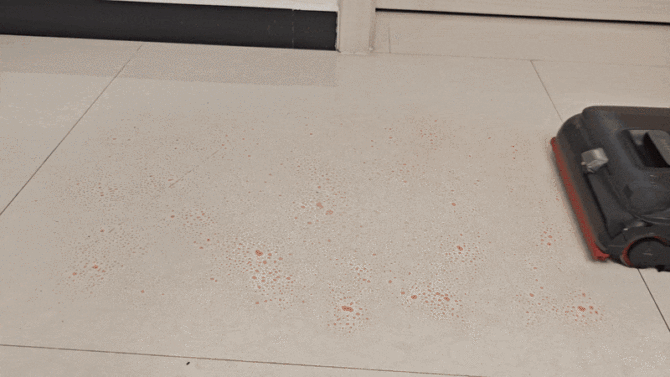 前机械臂还有一个非常重要的用途,当遇到清洁死角的时候,只需要向前推洗地机就好,当前机械臂碰到墙角的时候我们向后拉的瞬间会“锁住”墙角的污渍。得益于水箱下压的设计,追觅T60 Ultra可以更好的对地面施加压力,强大的压力可以更好地完成地面清洁。从下面的测试可以看到那么大一滩水被全部吸走,且墙角位置没有丝毫残留。