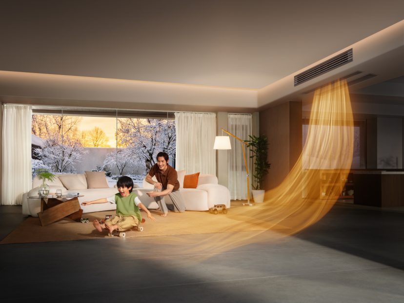 在内机送风设计方面,米家中央空调Pro 双风轮除了常规的单出风内机,还首次创新推出了双出风形态的内机,把中央空调送风舒适性提升到了全新的高度。区别于传统中央空调单一出风口的送风模式,双出风内机打破常规的中央空调内机的惯用思路,通过双通道、双出风的结构,在制冷时实现“天幕风”,冷风贴顶铺开,减少直吹不适;在制热时实现“地毯风”,热风直达地面,有效改善冬季头热脚冷问题。