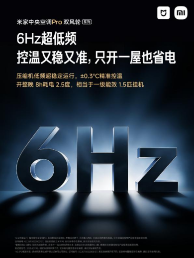 在能效方面,米家中央空调Pro 双风轮达到同档领先的超一级能效,其中 8 匹机型APF值可达 5.4。官方数据显示,全年可节省用电 1567 度。同时小米自主研发 6Hz 超低频技术,在低负荷场景下依然保持稳定输出,减少频繁启停带来的能耗与噪音,让夜间使用更加省电、安静。