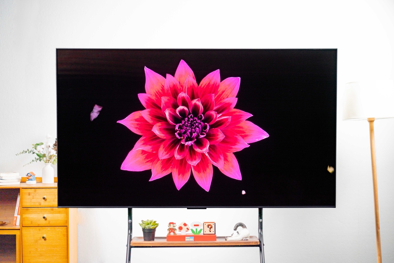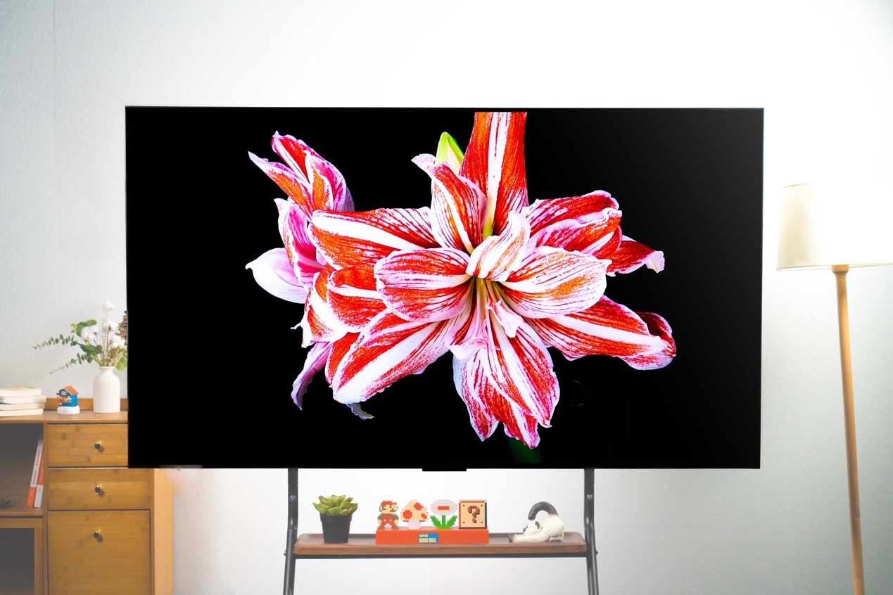 在花朵绽放等高对比画面中,主体区域明亮清晰,背景黑色深邃纯净,没有泛白或灰蒙现象,亮暗交界位置收得非常利落,几乎看不到明显光晕,整体画面显得干净通透。主观观感上,与以“无光晕”著称的 OLED 电视已经非常接近。