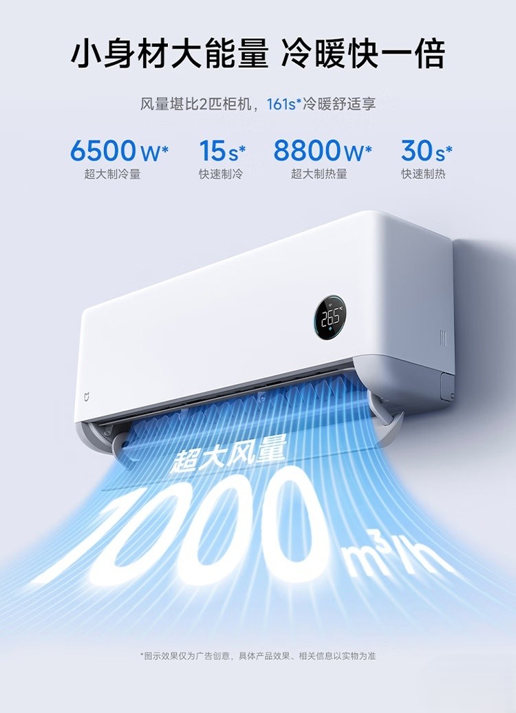 支持天幕风制冷和地毯风制热,搭载小米澎湃智联和米家灵云节能算法,APF 6.30 全年省电约 404 度。适合追求大风量和节能效果的客厅或大面积房间使用。