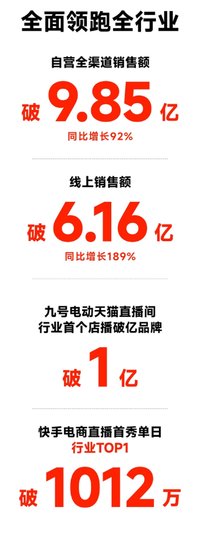 11月1日,九号公司公布了双11开门红战报。报告显示,九号公司实现自营全渠道销售额超9.85亿元,同比增长92%%,其中线上销售额超6.16亿元,同比增长189%%,为本轮11奠定了良好开局。