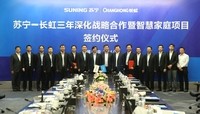 5月19日,长虹集团董事长赵勇等一行高管造访苏宁,与苏宁董事长张近东等高管团队举行了战略合作推进会,双方签署了一份“3年260亿”的战略合作协议,目标三年内完成彩电、冰洗、空调等品类260亿元的销售目标。会上,双方明确了新品推广、大单包销、精准营销、双线融合等多个方面战略举措。同时针对苏宁近期推出的“S-TV计划”、“S+空调”计划,与长虹推出的智能家居项目展开深入讨论,进一步扩大深化家庭互联网化产品的落地。